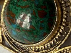 1 - Сейчас смешанная горная порода хризоколла + малахит + бирюза + другие минералы, содержащие медь, в основном добывают в Африке (ДР Конго). Так что если проба серебра современная, то и камень эйлатский, но не из Израиля.