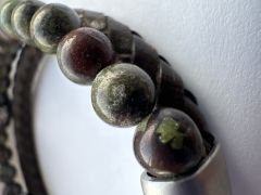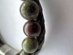 Приобрел браслет на одном из рынков Бангкока в качестве сувенира. В интернете нашел информацию, что торговое название камня "Кровь дракона", одни продавцы пишут, что это эпидот с гематитом, другие, что эпидот с пьемонтитом, третьи, что это вообще яшма.