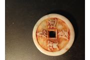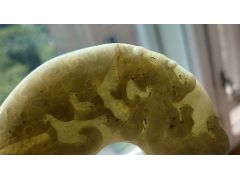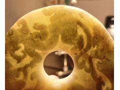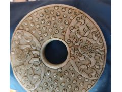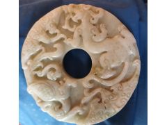 Давно на форуме не возникал "Диск би", поэтому решил привлечь Ваше внимание к предмету, приобретенному, как это обычно у меня случается, на блошином рынке. Продавец знакомый, тот самый, у которого не раз покупал предметы, приведенные, как он утверждал, из Китая, в том числе и из Тибета. Диск, диаметром 10 см, на мой взгляд, вырезан вполне профессионально, на одной стороне более рельефная резьба, и все та же "сладкая парочка" - дракон (саламандра и феникс). Другая сторона - традиционный китайский орнамент и опять изображение тех же двух любимых китайских персонажей, но они несколько отличаются, какие-то жирненькие и ног или крючков у птички явно больше, чем полагается. Но резьба красивая. Посылаю фото - первые три сделаны при дневном свете, а последнее - на просвет - при искусственном. Прошу Вас высказать свое компетентное суждение по поводу камня, мастерства резчика и времени создания диска, и все, что найдете нужным. С благодарностью заранее и пожеланиями всего наилучшего.....
