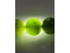 Светлые бусины идентифицировать сложно. Сомнения вызваны тем, что не обнаружили на фотографиях на просвет типичных для апокарбонатного речного нефрита хлопьев карбонатного скарна. Возможно это происходит за счет того, что Вы применили при фотографировании подсветку снизу камня и объектив засвечивается. При фотографировании камней на просвет необходимо применять подсветку СБОКУ.