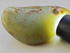 На Вашей фотографии нефрит полностью речной апокарбонатный БЕЗ ЗАМЕТНЫХ КРУПНЫХ ХЛОПЬЕВ КАРБОНАТНОГО СКАРНА. Такой нефрит добывается (добывался) в основном из реки Кавокта в Забайкалье. На этом всё.