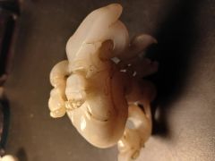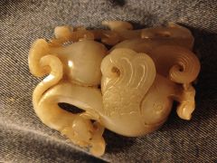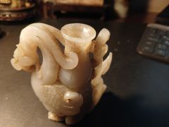 Птичка с кувшинчиком. Админ: Виртуозный новодел из бирманского жадеита.Здравствуйте, уважаемые эксперты! Мое почтение, господин Аметистов! В минувшую субботу приобрел, как обычно на блошином рынке, предмет, который хотел бы показать Вам и узнать Ваше компетентное суждение. Это небольшая фигурка птички-феникса с кувшинчиком на спине и маленьким птенцом на кувшинчике. Продавец -один из ветеранов рыночной торговли, парень, специализирующийся на предметах из ЮВА, главным образом из Таиланда и Китая, который регулярно зимует в Таиланде и привозит оттуда товар тайского и китайского происхождения и продает на блошином рынке. В основном - "ширпотреб", но иногда попадаются и интересные вещи. Не обошлось без маленького курьеза - он предложил купить симпатичного дракончика, в действительности оказавшимся при внимательном рассмотрении птичкой фениксом, с миниатюрным кувшинчиком на спине и птенцом. Мне показалась вещь интересной, работа сложная, мастер постарался сохранить изначальную форму камня, поэтому птичка получилась с изогнутым хвостом. Я полагаю, что это нефрит, но надеюсь на Вас, что Вы, как всегда, выскажете Ваше компетентное суждение о самом камне, возрасте изделия и мастерстве резчика. С искренней благодарностью....